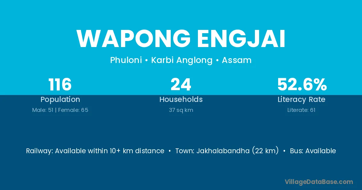 Jakhalabandha (22 km) is the nearest town to Wapong Engjai village for major economic activities and is located approximately 22 km away.