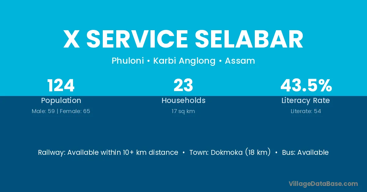 Dokmoka (18 km) is the nearest town to X Service Selabar village for major economic activities and is located approximately 18 km away.