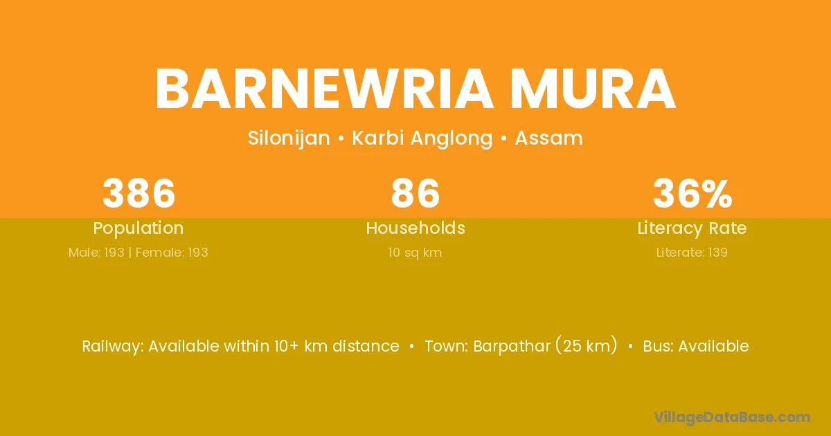 Barpathar (25 km) is the nearest town to Barnewria Mura village for major economic activities and is located approximately 25 km away.