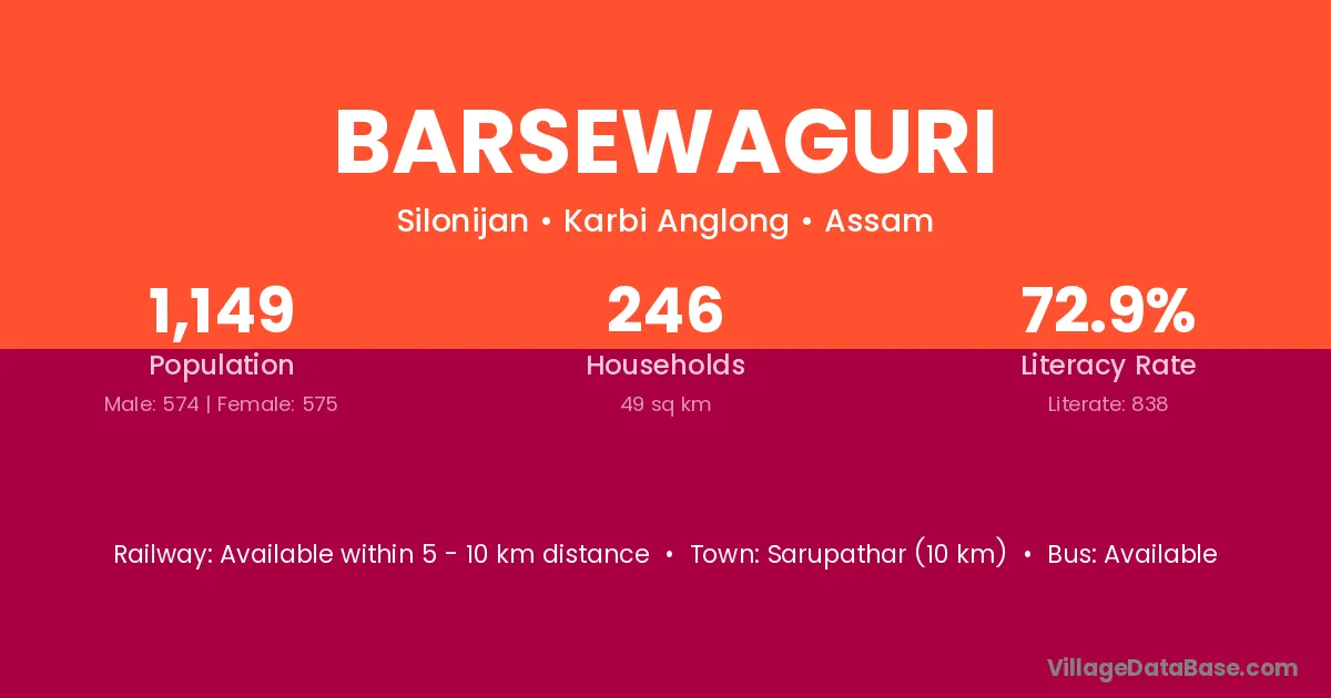 Barsewaguri village has a total population of 1,149 people, of which 574 are males and 575 are females.