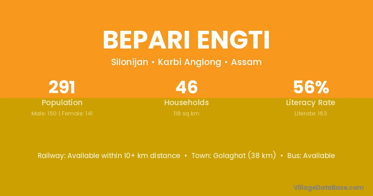 Golaghat (38 km) is the nearest town to Bepari Engti village for major economic activities and is located approximately 38 km away.