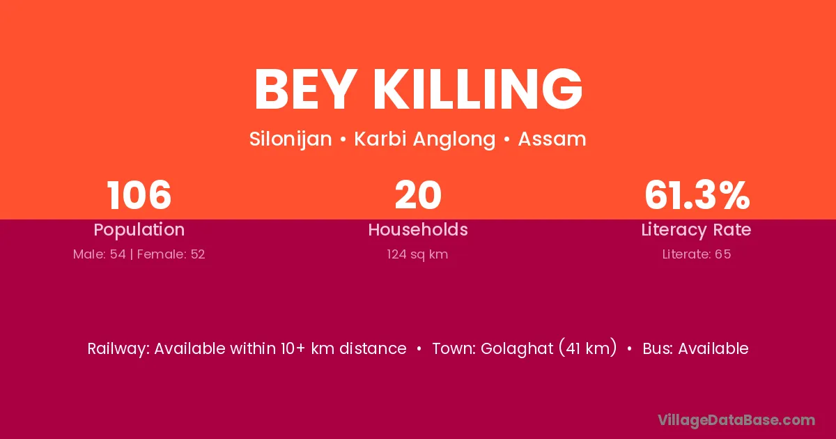 Golaghat (41 km) is the nearest town to Bey Killing village for major economic activities and is located approximately 41 km away.
