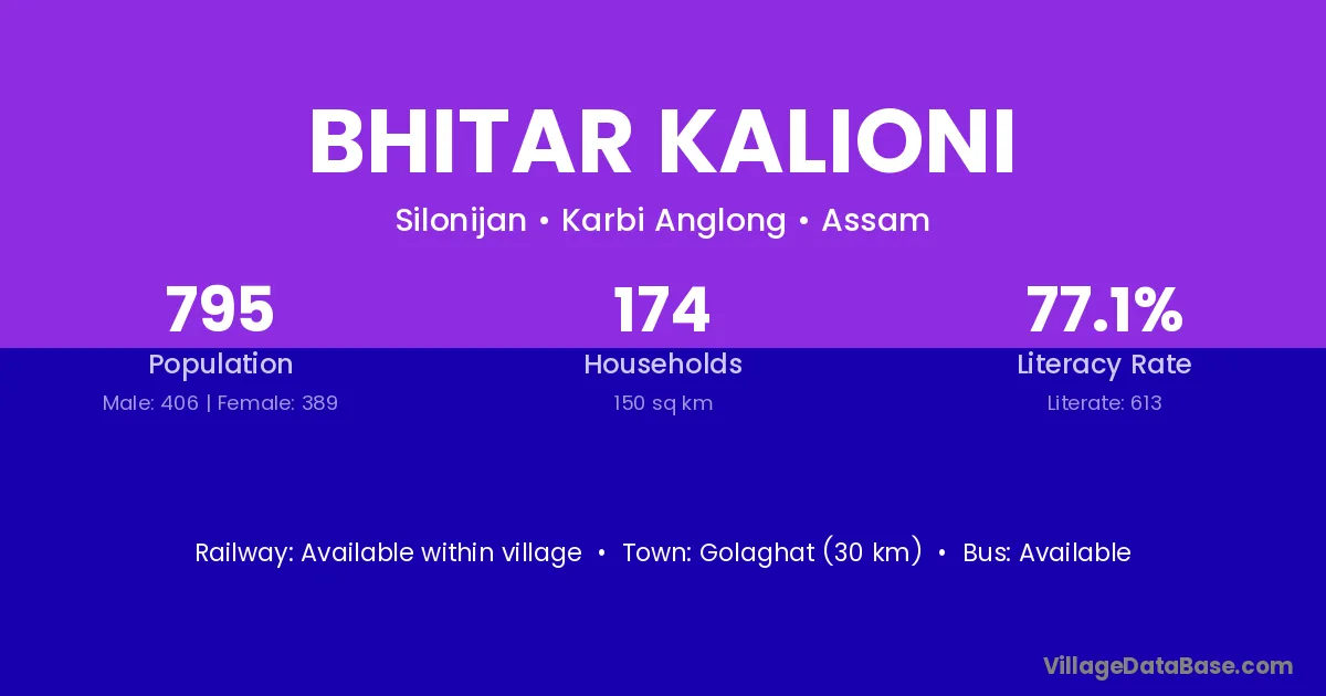 Golaghat (30 km) is the nearest town to Bhitar Kalioni village for major economic activities and is located approximately 30 km away.