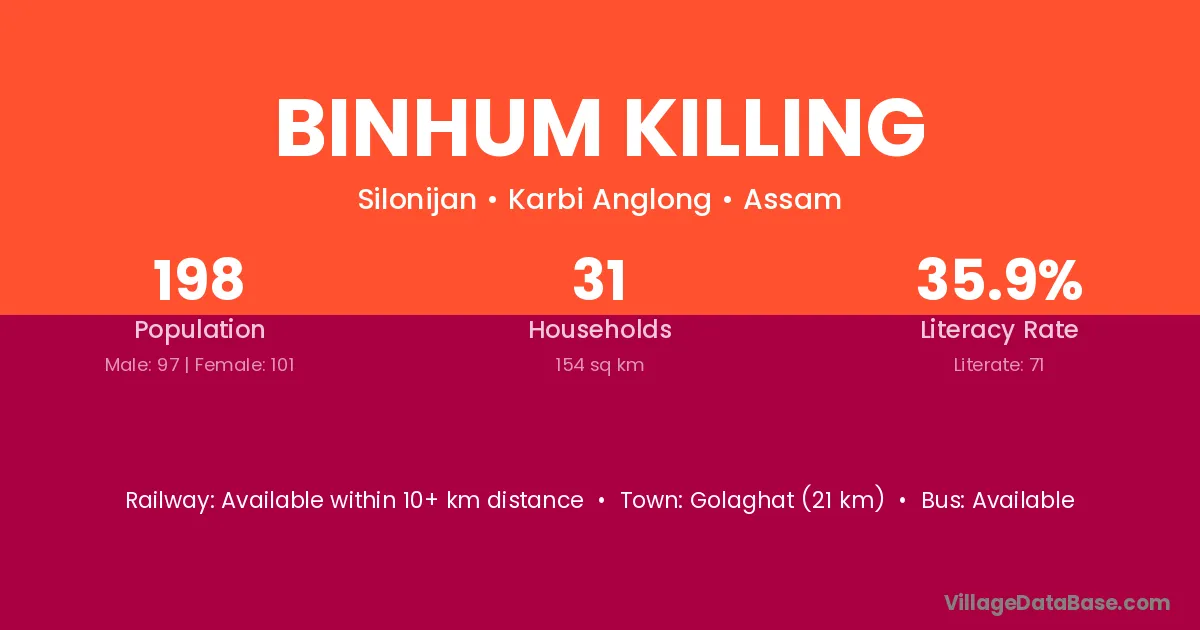 Golaghat (21 km) is the nearest town to Binhum Killing village for major economic activities and is located approximately 21 km away.