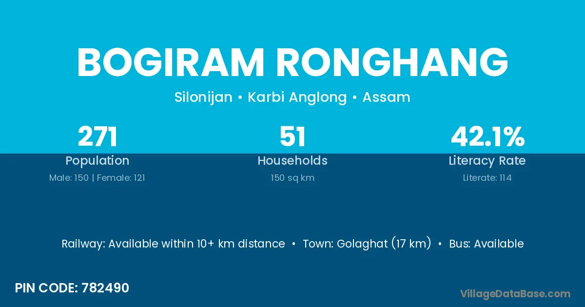 Golaghat (17 km) is the nearest town to Bogiram Ronghang village for major economic activities and is located approximately 17 km away.