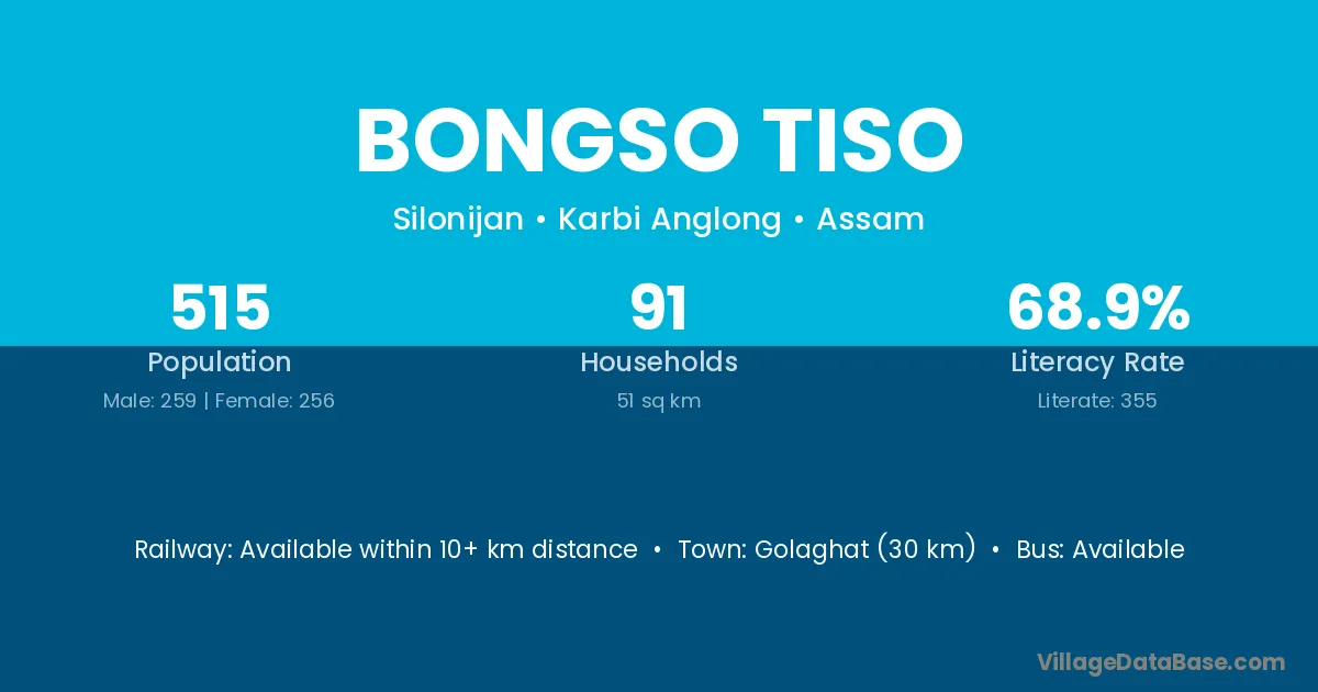 Golaghat (30 km) is the nearest town to Bongso Tiso village for major economic activities and is located approximately 30 km away.