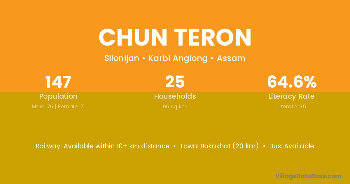 Bokakhat (20 km) is the nearest town to Chun Teron village for major economic activities and is located approximately 20 km away.