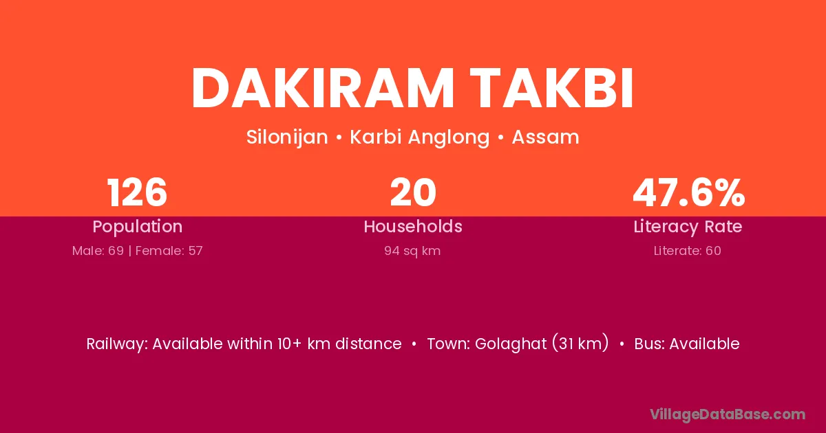 Golaghat (31 km) is the nearest town to Dakiram Takbi village for major economic activities and is located approximately 31 km away.