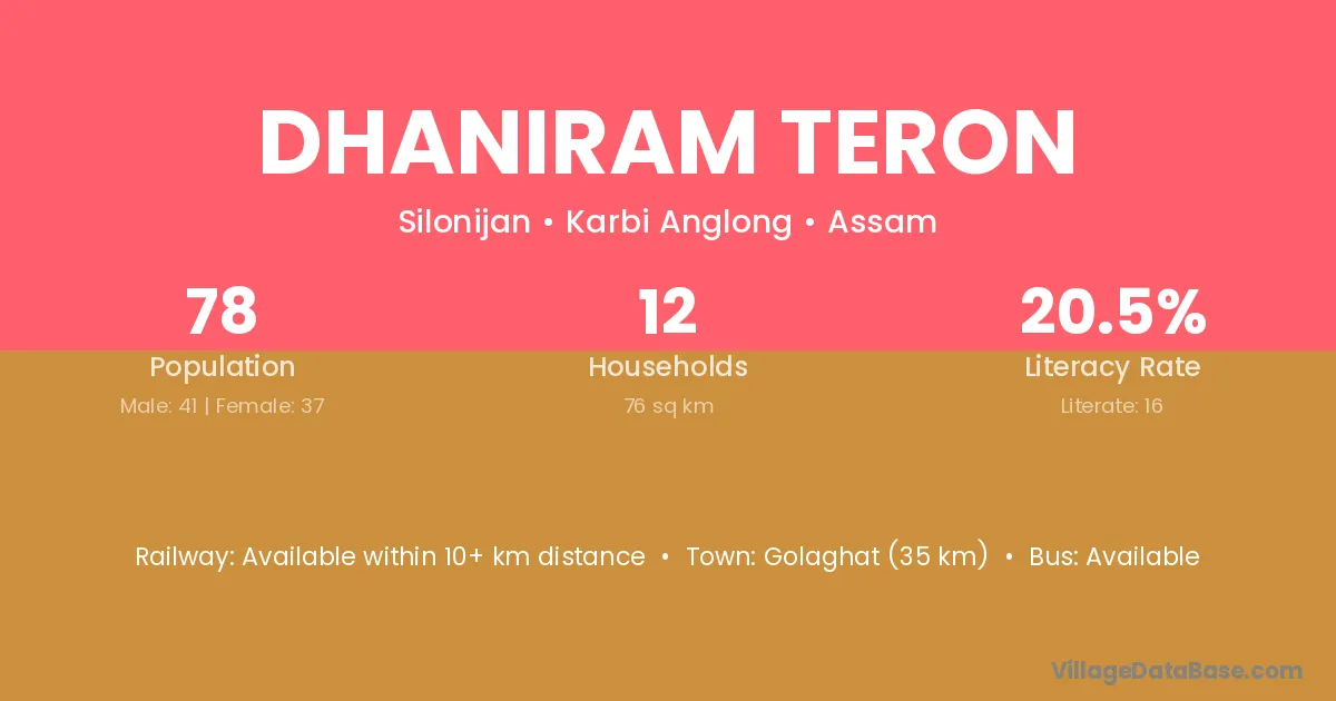 Dhaniram Teron village has a total population of 78 people, of which 41 are males and 37 are females.