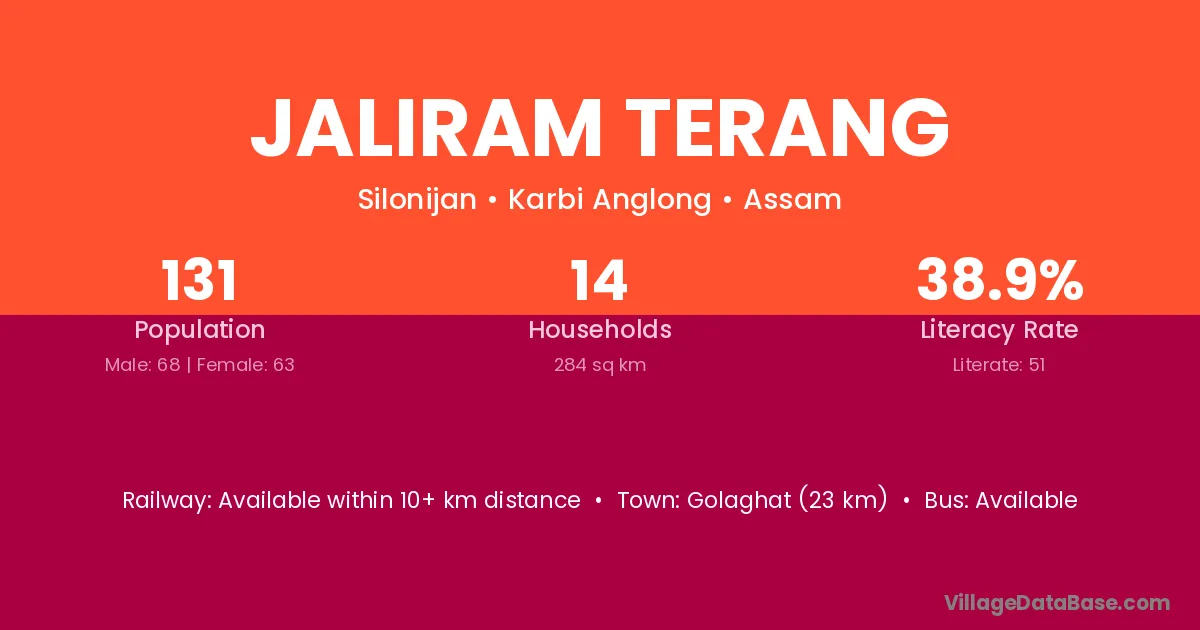 Golaghat (23 km) is the nearest town to Jaliram Terang village for major economic activities and is located approximately 23 km away.