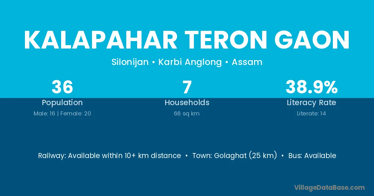 Kalapahar Teron Gaon village has a total population of 36 people, of which 16 are males and 20 are females.