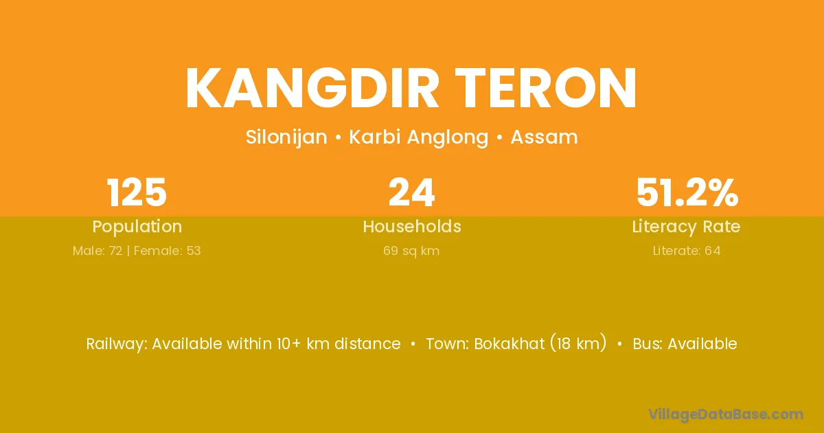 Bokakhat (18 km) is the nearest town to Kangdir Teron village for major economic activities and is located approximately 18 km away.