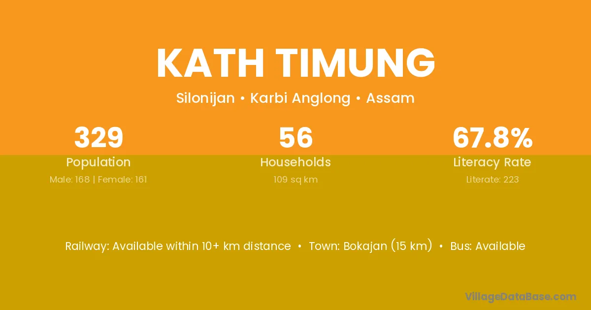 Bokajan (15 km) is the nearest town to Kath Timung village for major economic activities and is located approximately 15 km away.