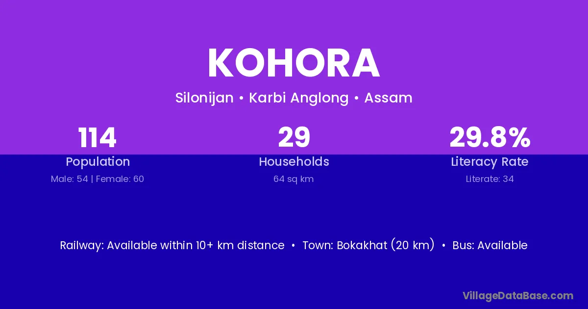 Bokakhat (20 km) is the nearest town to Kohora village for major economic activities and is located approximately 20 km away.