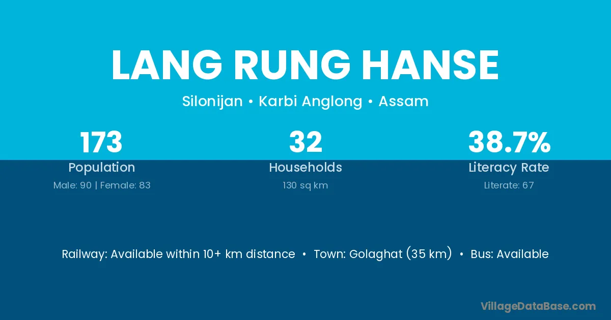 Golaghat (35 km) is the nearest town to Lang Rung Hanse village for major economic activities and is located approximately 35 km away.
