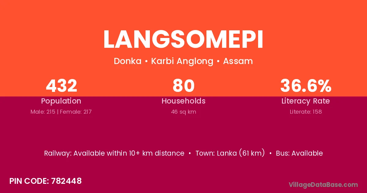 Golaghat (32 km) is the nearest town to Langsomepi village for major economic activities and is located approximately 32 km away.