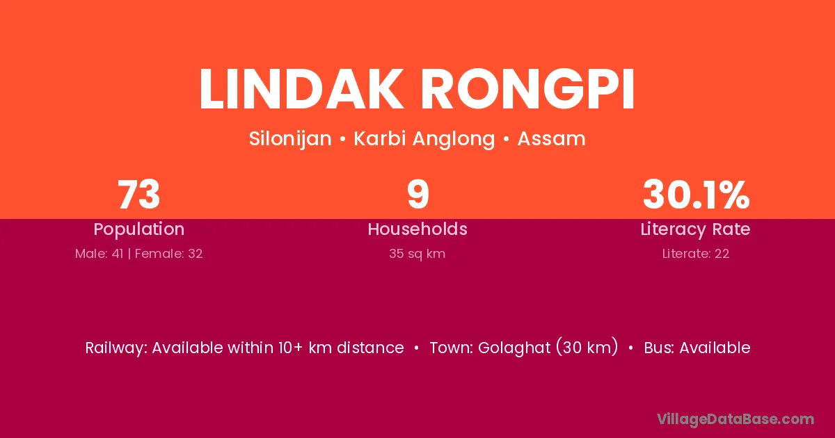 Golaghat (30 km) is the nearest town to Lindak Rongpi village for major economic activities and is located approximately 30 km away.