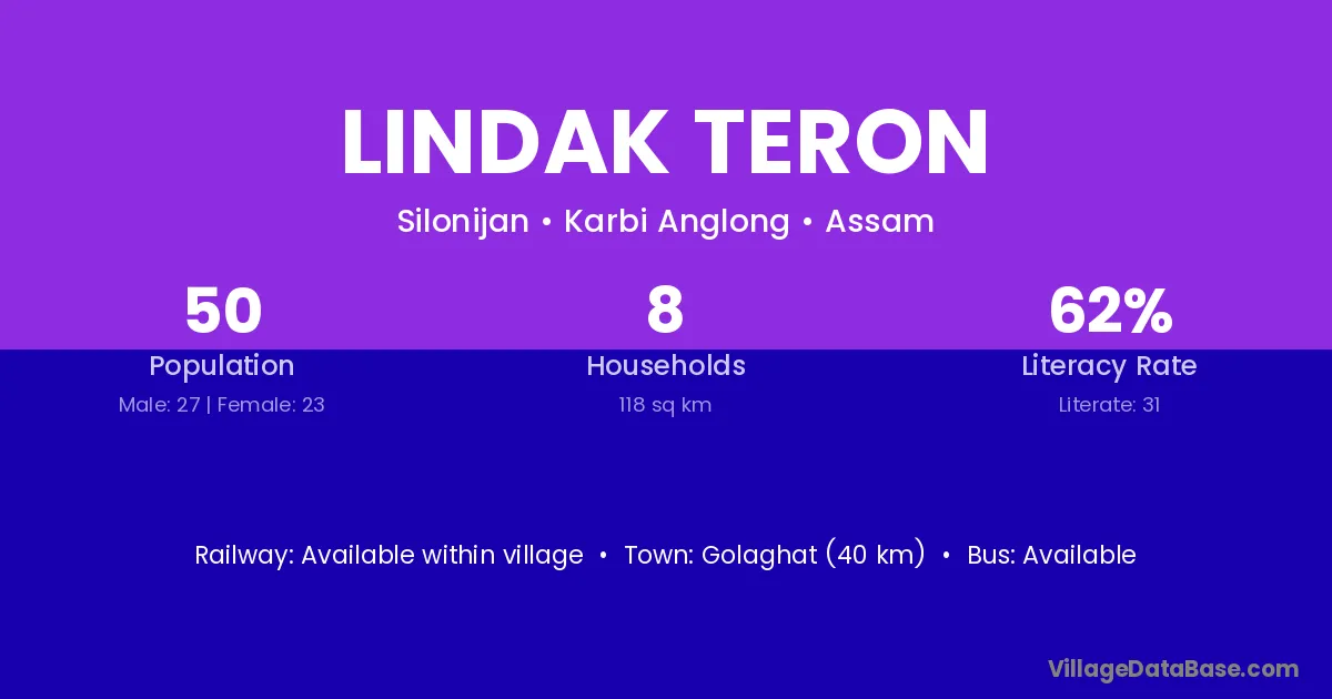 Golaghat (40 km) is the nearest town to Lindak Teron village for major economic activities and is located approximately 40 km away.