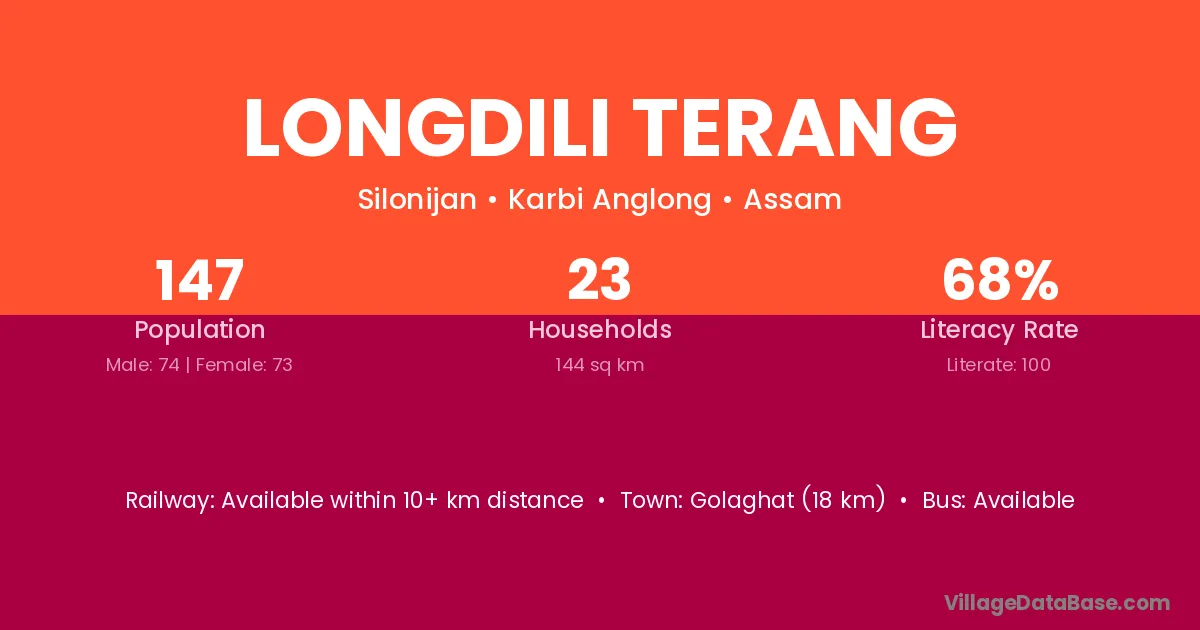 Golaghat (18 km) is the nearest town to Longdili Terang village for major economic activities and is located approximately 18 km away.
