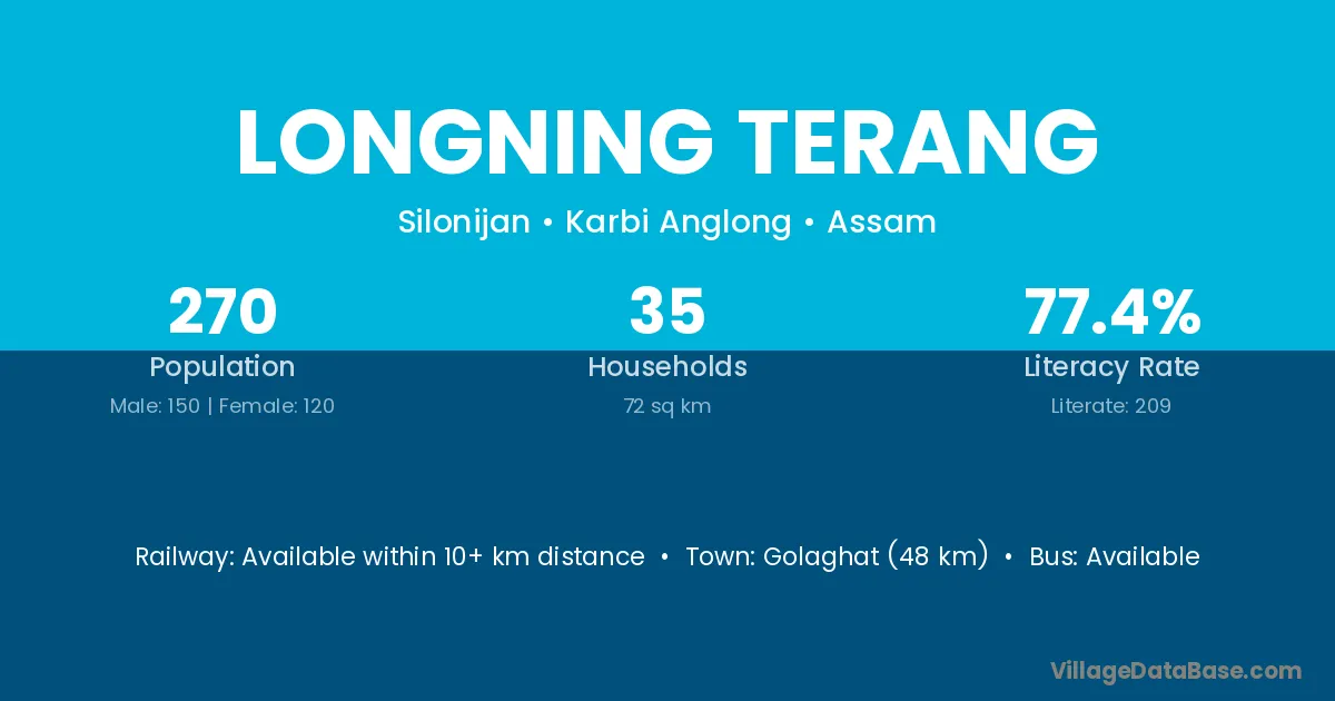 Golaghat (48 km) is the nearest town to Longning Terang village for major economic activities and is located approximately 48 km away.
