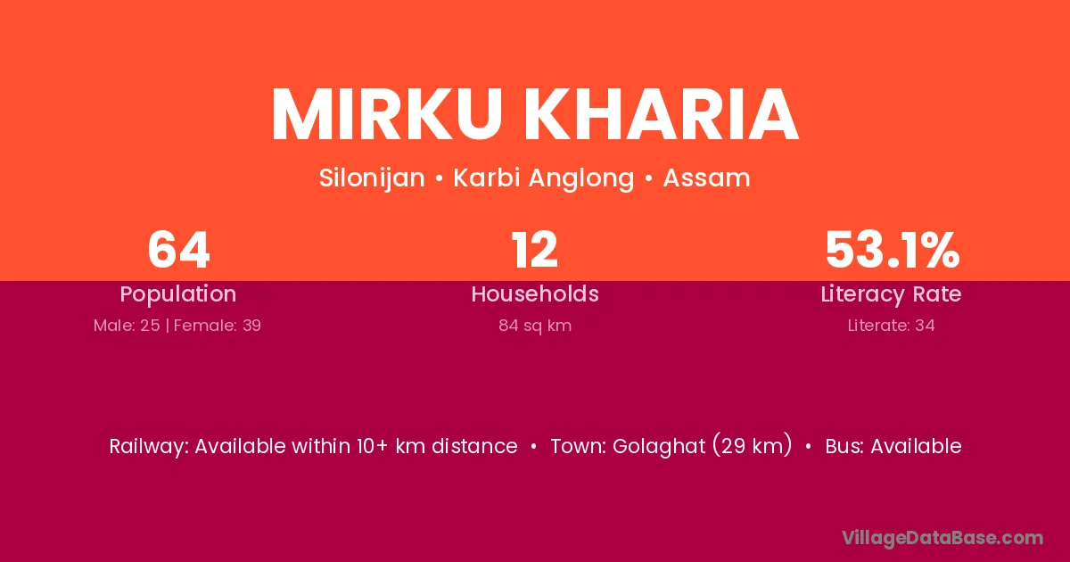 Golaghat (29 km) is the nearest town to Mirku Kharia village for major economic activities and is located approximately 29 km away.
