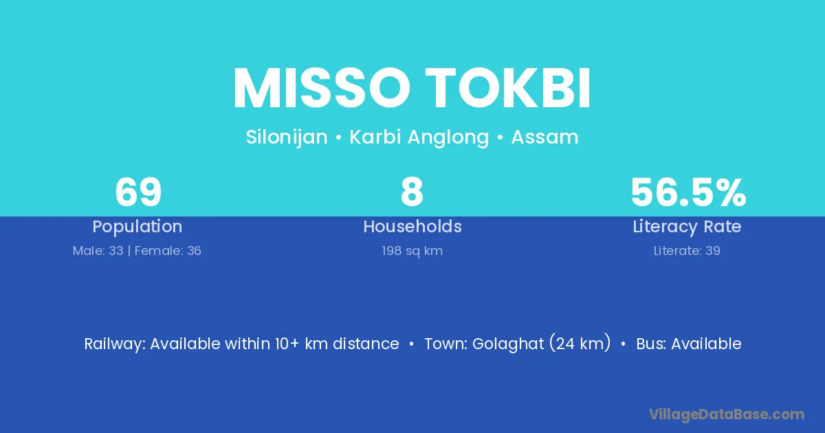Golaghat (24 km) is the nearest town to Misso Tokbi village for major economic activities and is located approximately 24 km away.