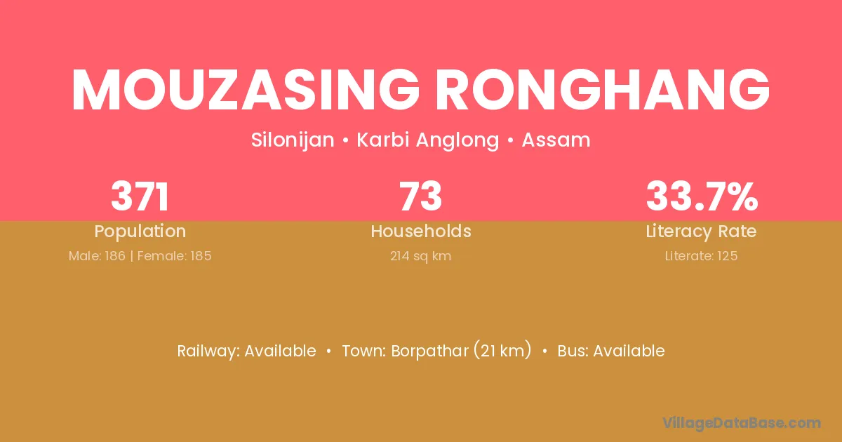 Mouzasing Ronghang village has a total population of 371 people, of which 186 are males and 185 are females.