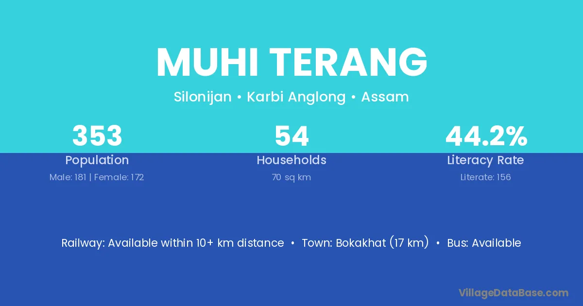 Bokakhat (17 km) is the nearest town to Muhi Terang village for major economic activities and is located approximately 17 km away.