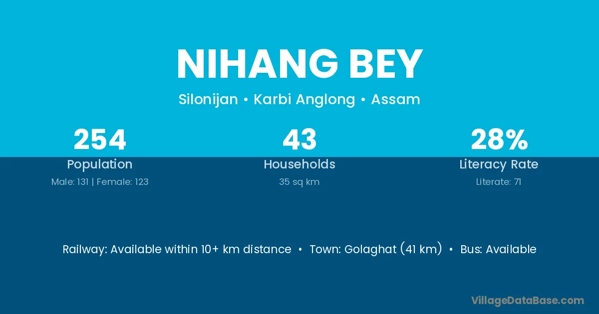 Golaghat (41 km) is the nearest town to Nihang Bey village for major economic activities and is located approximately 41 km away.