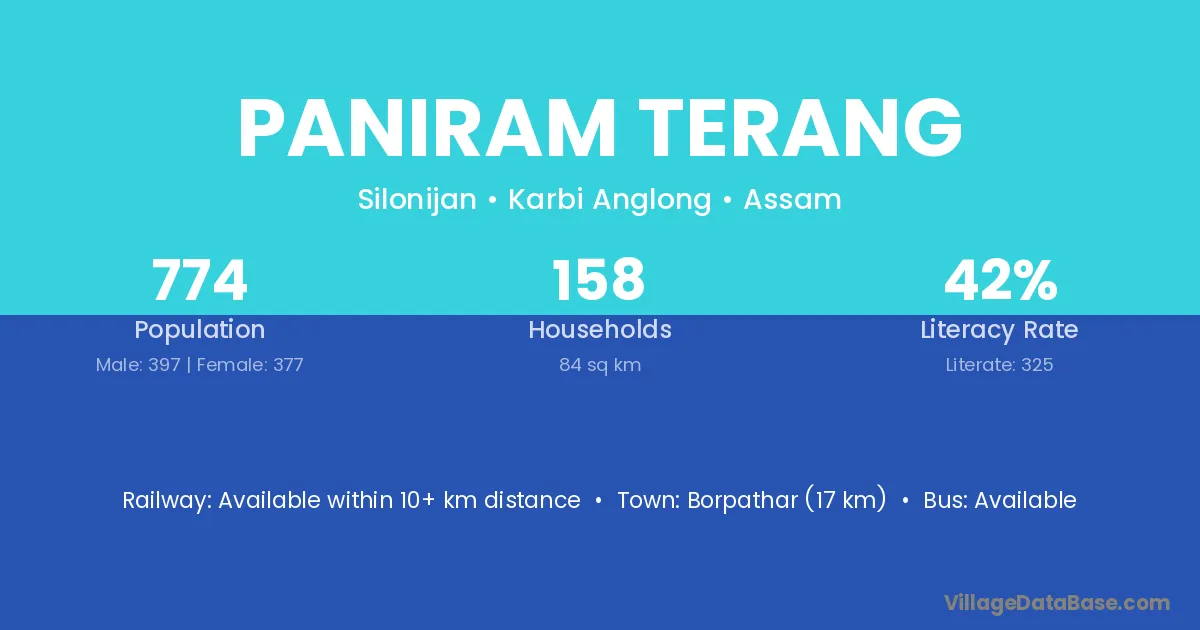 Borpathar (17 km) is the nearest town to Paniram Terang village for major economic activities and is located approximately 17 km away.