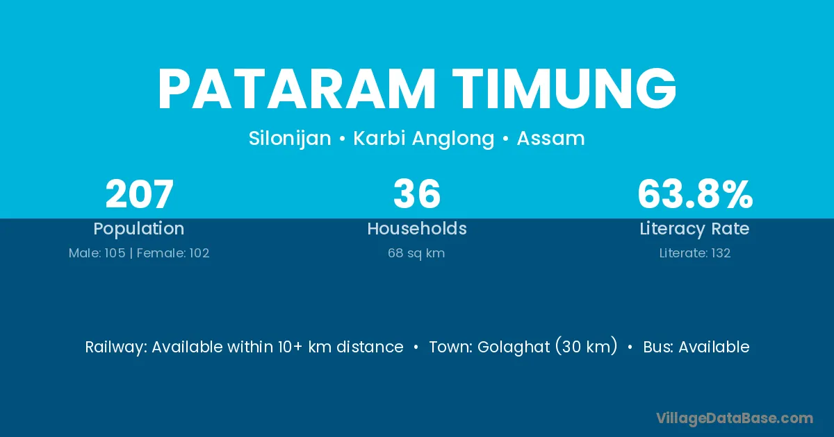 Golaghat (30 km) is the nearest town to Pataram Timung village for major economic activities and is located approximately 30 km away.