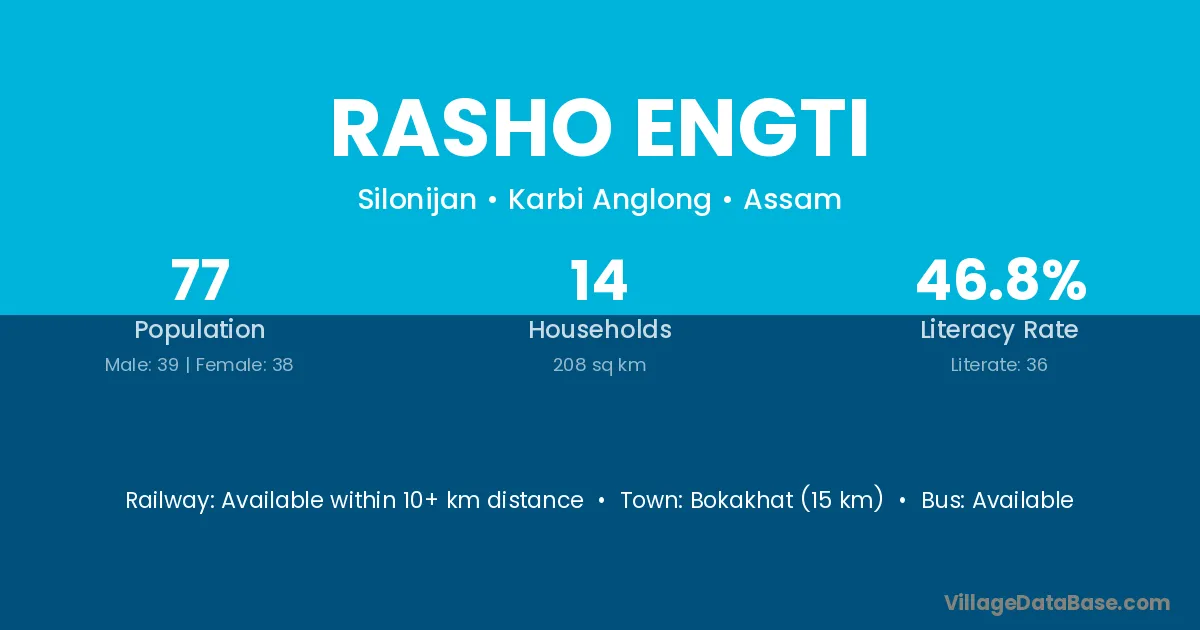 Bokakhat (15 km) is the nearest town to Rasho Engti village for major economic activities and is located approximately 15 km away.