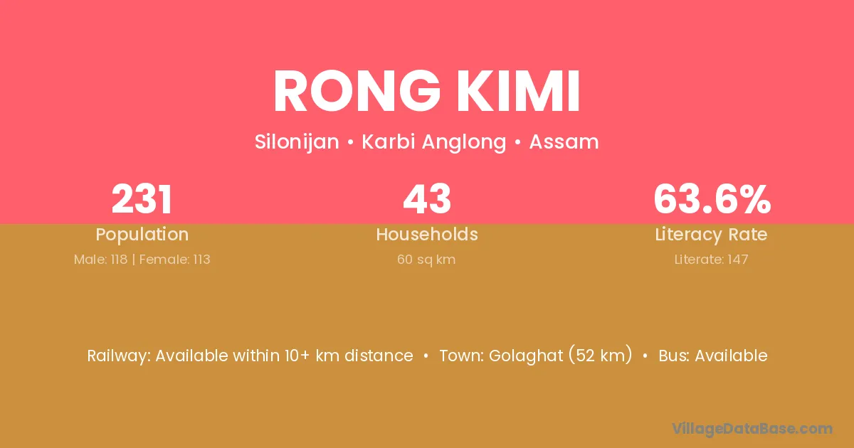 Rong Kimi village has a total population of 231 people, of which 118 are males and 113 are females.