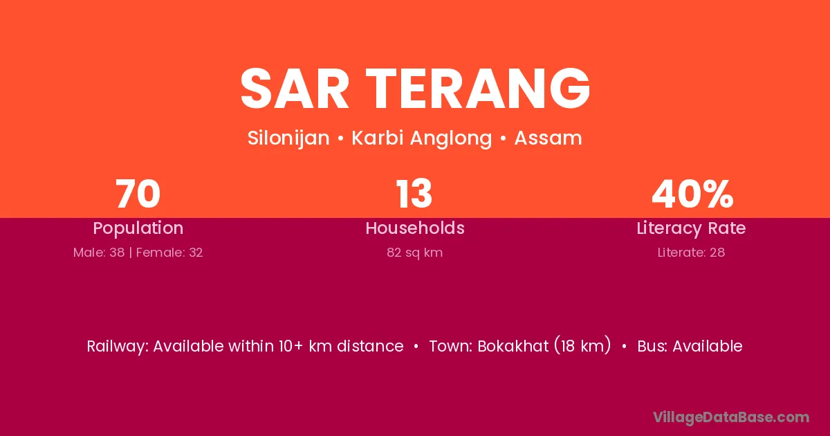 Bokakhat (18 km) is the nearest town to Sar Terang village for major economic activities and is located approximately 18 km away.