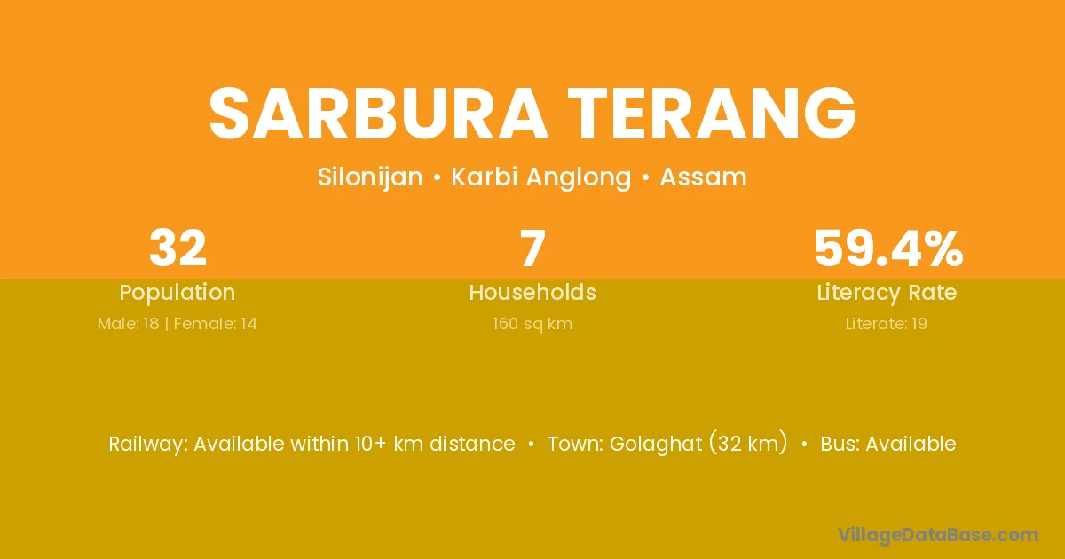 Golaghat (32 km) is the nearest town to Sarbura Terang village for major economic activities and is located approximately 32 km away.