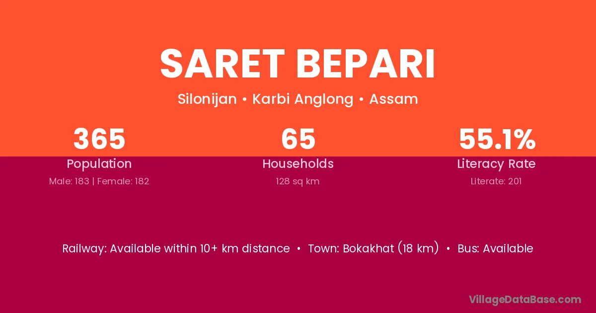 Bokakhat (18 km) is the nearest town to Saret Bepari village for major economic activities and is located approximately 18 km away.