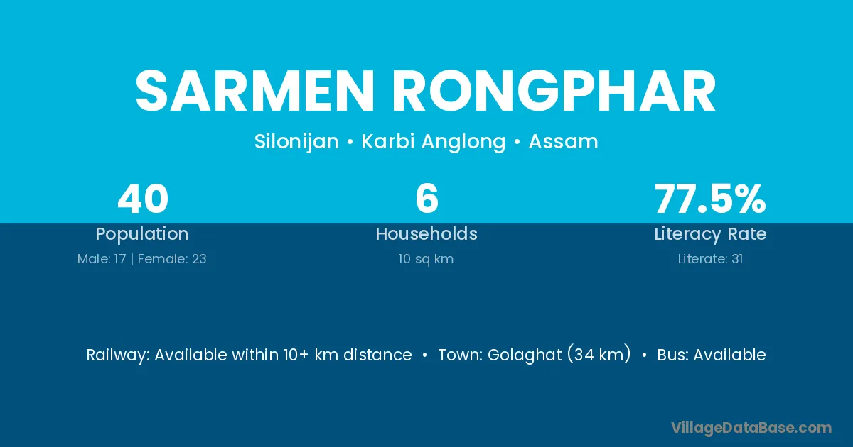 Golaghat (34 km) is the nearest town to Sarmen Rongphar village for major economic activities and is located approximately 34 km away.