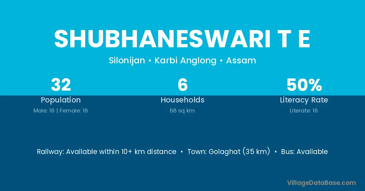 Golaghat (35 km) is the nearest town to Shubhaneswari T E village for major economic activities and is located approximately 35 km away.