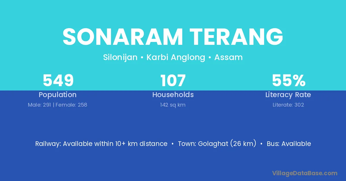 Golaghat (26 km) is the nearest town to Sonaram Terang village for major economic activities and is located approximately 26 km away.