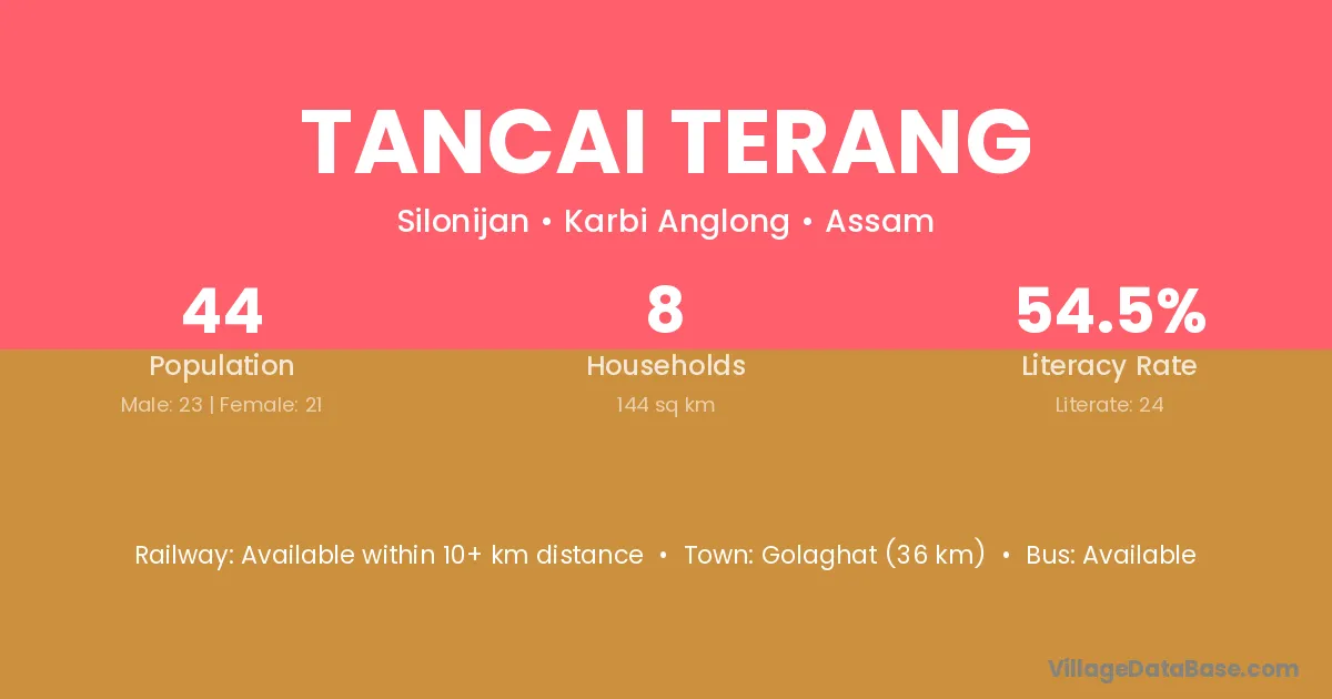 Golaghat (36 km) is the nearest town to Tancai Terang village for major economic activities and is located approximately 36 km away.