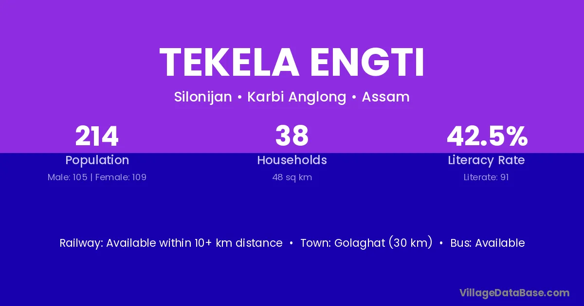 Golaghat (30 km) is the nearest town to Tekela Engti village for major economic activities and is located approximately 30 km away.