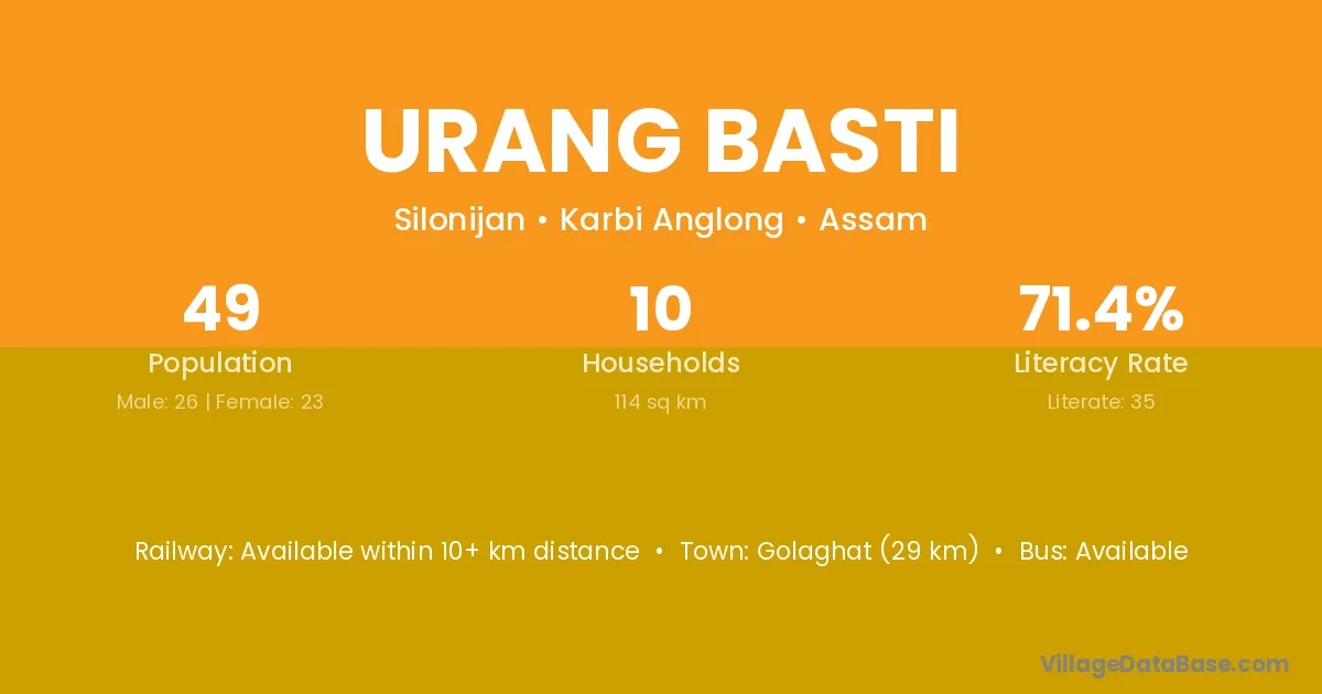 Golaghat (29 km) is the nearest town to Urang Basti village for major economic activities and is located approximately 29 km away.