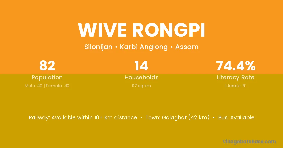Golaghat (42 km) is the nearest town to Wive Rongpi village for major economic activities and is located approximately 42 km away.