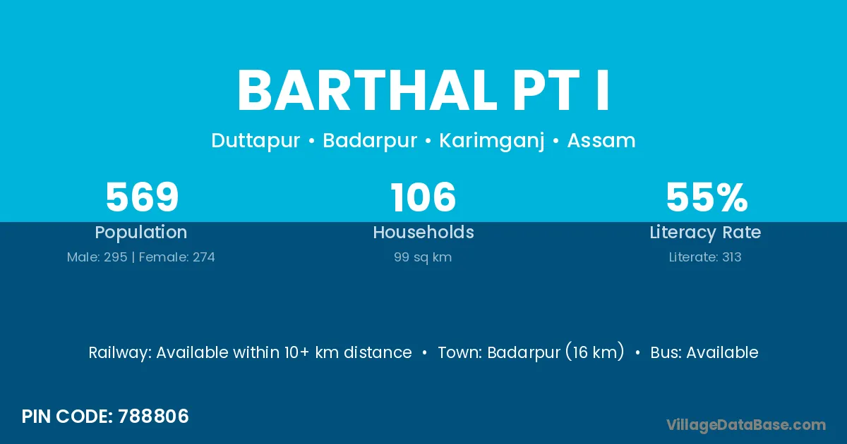 Badarpur (16 km) is the nearest town to Barthal Pt I village for major economic activities and is located approximately 16 km away.
