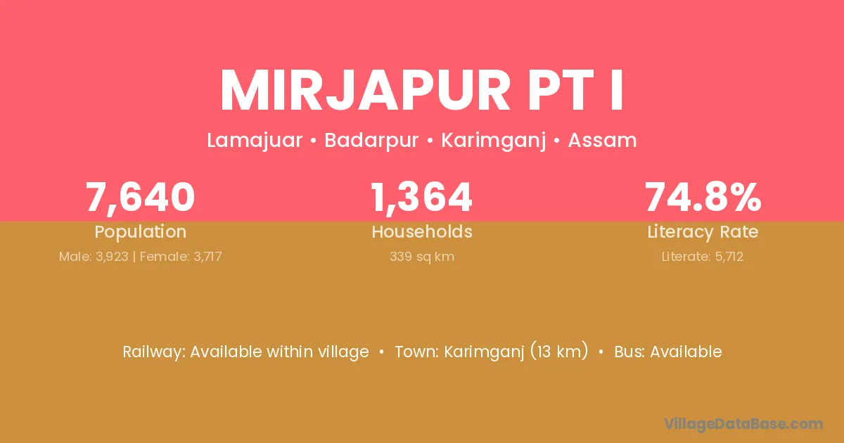 Karimganj (13 km) is the nearest town to Mirjapur Pt I village for major economic activities and is located approximately 13 km away.