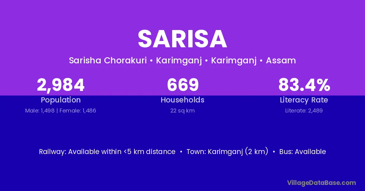 Karimganj (2 km) is the nearest town to Sarisa village for major economic activities and is located approximately 2 km away.