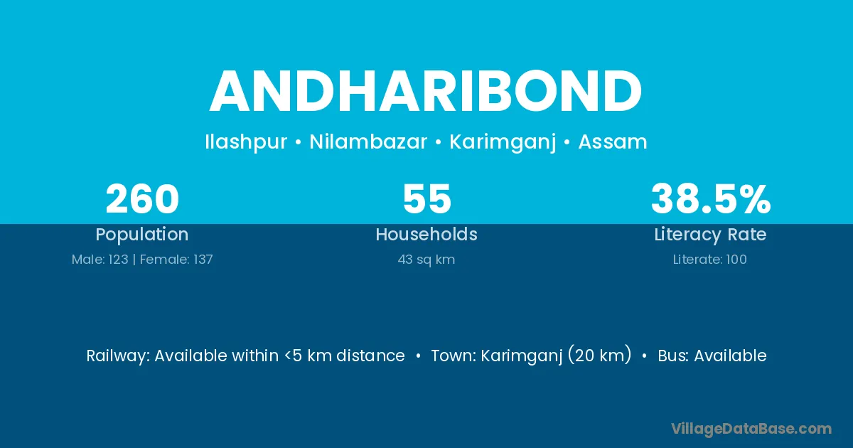 Karimganj (20 km) is the nearest town to Andharibond village for major economic activities and is located approximately 20 km away.