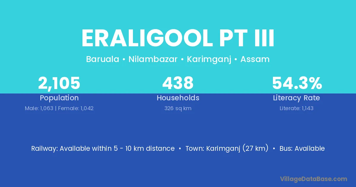 Karimganj (27 km) is the nearest town to Eraligool Pt Iii village for major economic activities and is located approximately 27 km away.