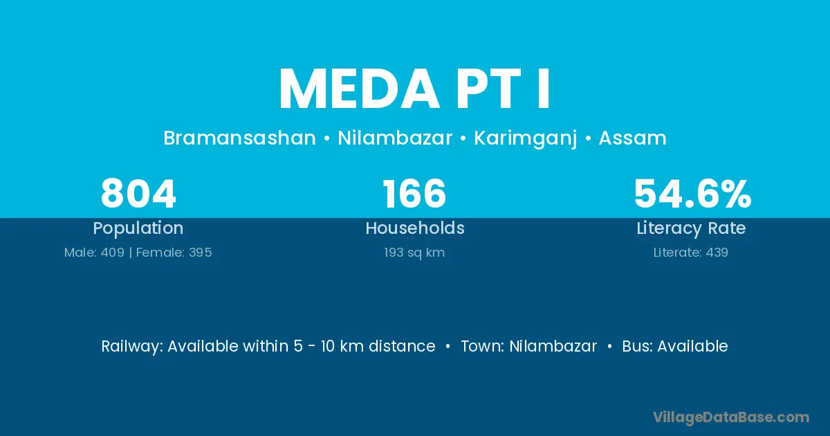 Meda Pt I village has a total population of 804 people, of which 409 are males and 395 are females.