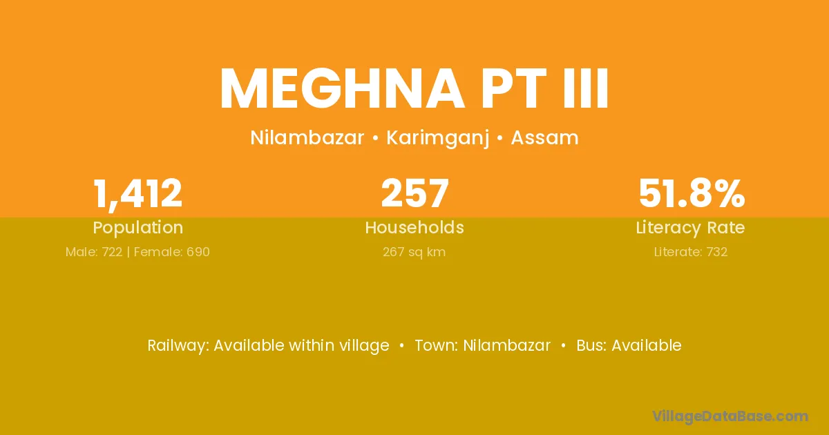 Meghna Pt Iii village has a total population of 1,412 people, of which 722 are males and 690 are females.